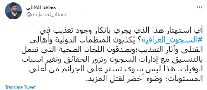وقال في تغريدة عبر "تويتر" رصدها "المشهد العربي": "أي استهتار هذا الذي يجري بإنكار وجود تعذيب في السجون العراقية؟ يُكذبون المنظمات الدولية وأهالي القتلى وآثار التعذيب؛ ويصدقون اللجان الصحية التي تعمل بالتنسيق مع إدارات السجون وتزور الحقائق وتغير أسباب الوفيات".