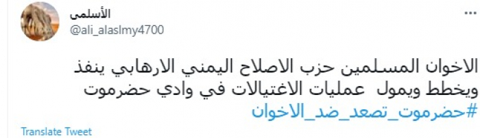 وقال في تغريدة عبر "تويتر" رصدها "المشهد العربي": "الإخوان المسلمين حزب الإصلاح اليمني الارهابي ينفذ ويخطط ويمول عمليات الاغتيالات في وادي حضرموت".