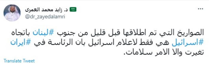 وقال في تغريدة عبر "تويتر" رصدها "المشهد العربي": "الصواريخ التي تم إطلاقها قبل قليل من جنوب لبنان باتجاه إسرائيل هي فقط لإعلام إسرائيل بأن الرئاسة في إيران تغيرت وإلا الأمر سلامات".