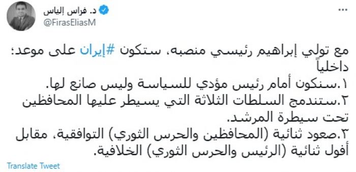 كشف الباحث السياسي العراقي فراس إلياس، اليوم الجمعة، عن شكل المشهد السياسي في إيران بالتزامن مع تولي إبراهيم رئيسي رئاسة إيران.
