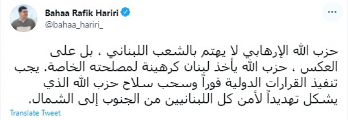 دعا السياسي اللبناني البارز بهاء الحريري، اليوم الجمعة، إلى سحب سلاح حزب الله، مؤكدًا أن ذلك الحزب يأخذ لبنان كرهينة لمصلحته الخاصة.