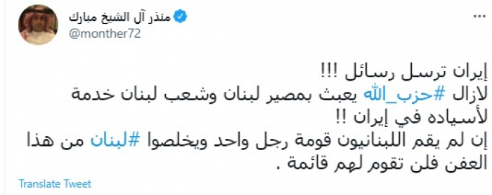 حذر المدون السعودي البارز منذر آل الشيخ مبارك، اليوم الجمعة، من خطورة استمرار خدمة حزب الله لإيران على حساب مصير وشعب لبنان.