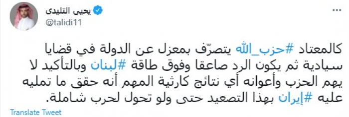 هاجم المحلل السياسي السعودي يحيى التليدي، اليوم الجمعة، حزب الله اللبناني، بسبب ممارساته الأخيرة تجاه إسرائيل والتي تُهدد الدولة اللبنانية.