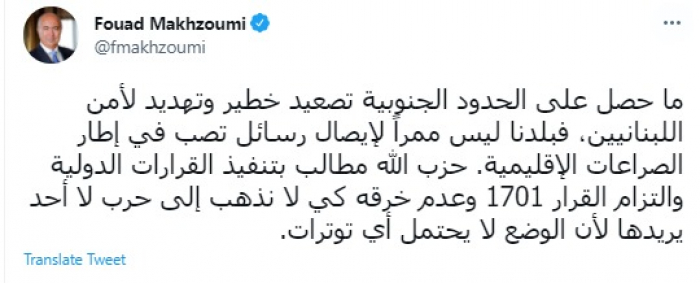 وقال في تغريدة عبر "تويتر" رصدها "المشهد العربي": "ما حصل على الحدود الجنوبية تصعيد خطير وتهديد لأمن اللبنانيين، فبلدنا ليس ممراً لإيصال رسائل تصب في إطار الصراعات الإقليمية".