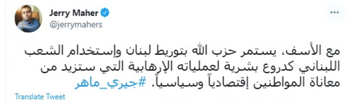 انتقد الكاتب الصحفي اللبناني جيري ماهر، اليوم الجمعة، حزب الله اللبناني، مؤكدًا أن أفعاله وعملياته الإرهابية ستزيد من معاناة الشعب اللبناني.