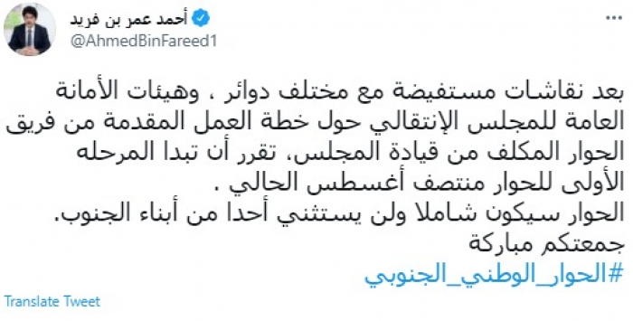 وقال في تغريدة عبر "تويتر" رصدها "المشهد العربي": "بعد نقاشات مستفيضة مع مختلف دوائر، وهيئات الأمانة العامة للمجلس الانتقالي حول خطة العمل المقدمة من فريق الحوار المكلف من قيادة المجلس، تقرر أن تبدأ المرحلة الأولى للحوار منتصف أغسطس الحالي".