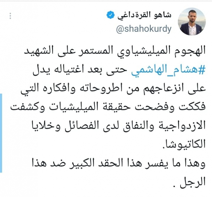 اعتبر الكاتب الصحفي شاهو قرة داغي، أن استمرار المليشيات الموالية لإيران في العراق، في تشويه سيرة الباحث الشهيد هشام الهاشمي، حقد على وازدواجية وقلق من أفكاره.
