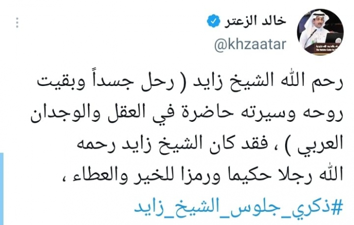 وقال في تغريدة على حسابه بموقع التدوين المصغر تويتر، اليوم: "رحم الله الشيخ زايد (رحل جسداً وبقيت روحه وسيرته حاضرة في العقل والوجدان العربي)".