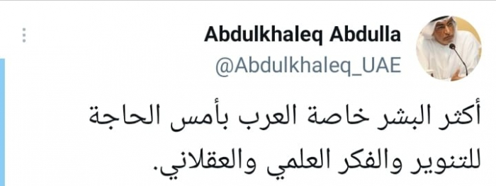 اعتبر الأكاديمي الدكتور عبدالخالق عبدالله، أن الشعوب العربية في حاجة أكثر من غيرها للتنوير والعقلانية.