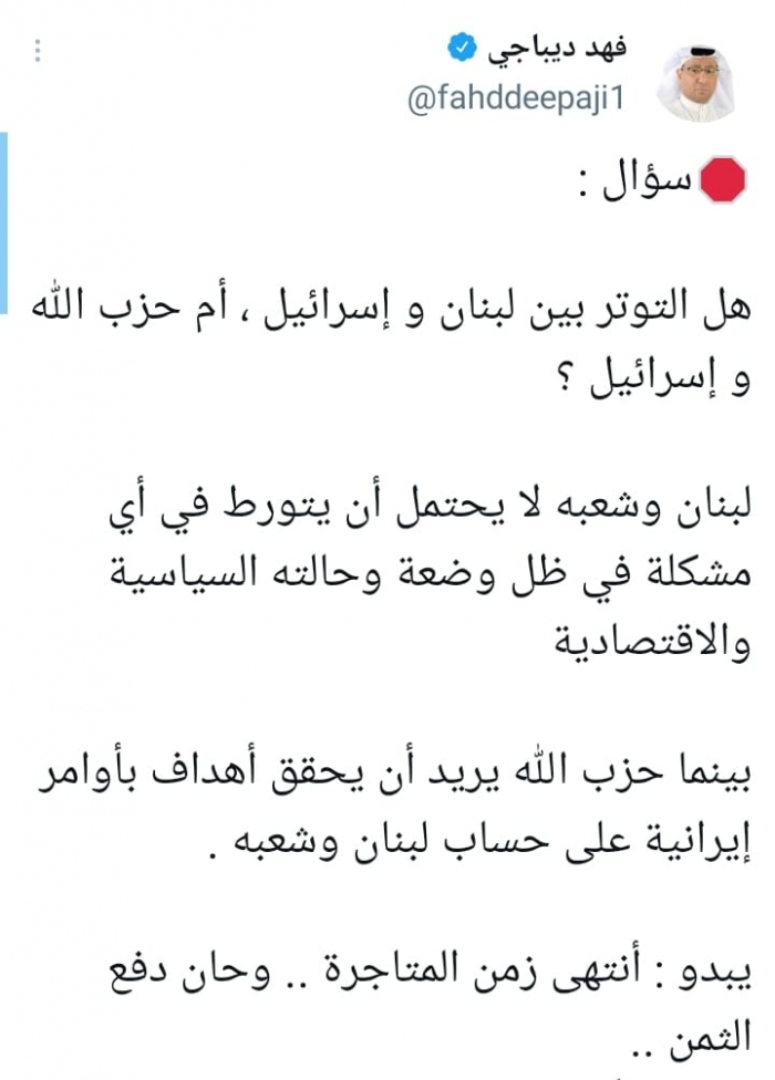 هاجم المحلل السياسي السعودي فهد ديباجي، مليشيات حزب الله الموالية لإيران، لمحاولاتها التصعيد عسكريا مع إسرائيل في ظل أزمة عاصفة داخل لبنان.