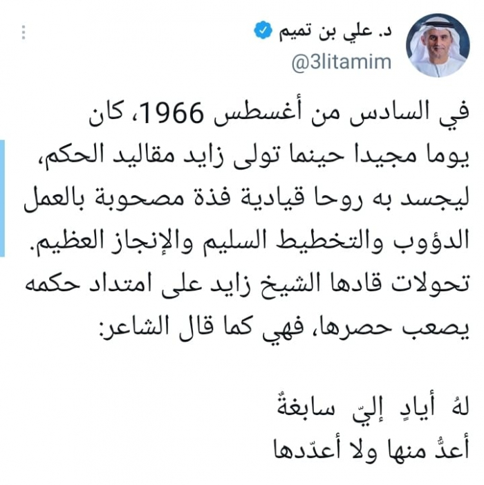 وقال في تغريدة على حسابه بموقع التدوين المصغر تويتر، اليوم إنه: "في السادس من أغسطس 1966، كان يوما مجيدا حينما تولى زايد مقاليد الحكم".