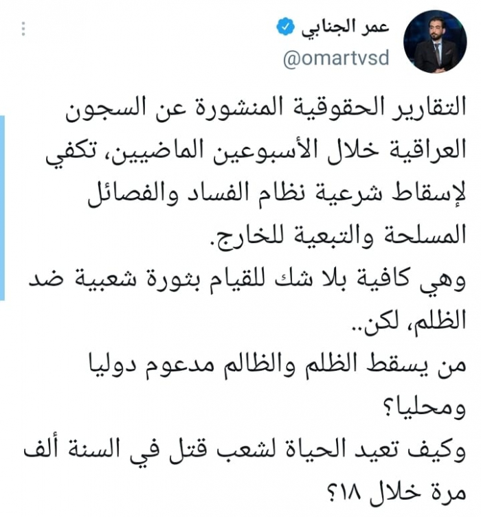 وأوضح في تغريدة على حسابه بموقع التدوين المصغر تويتر، اليوم أن: "التقارير الحقوقية المنشورة عن السجون العراقية خلال الأسبوعين الماضيين، تكفي لإسقاط شرعية نظام الفساد والفصائل المسلحة والتبعية للخارج".