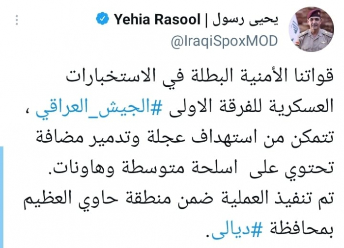 وأشار في تغريدة على حسابه بموقع التدوين المصغر تويتر، اليوم إلى أن: "قواتنا الأمنية البطلة في الاستخبارات العسكرية للفرقة الأولى بالجيش العراقي، تتمكن من استهداف عجلة وتدمير مضافة تحتوي على أسلحة متوسطة وهاونات".