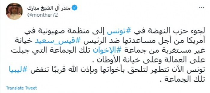 استنكر المدون السعودي البارز منذر آل الشيخ مبارك، اليوم السبت، استقواء حركة النهضة الإخوانية بالخارج للهجوم على الرئيس التونسي قيس سعيد.