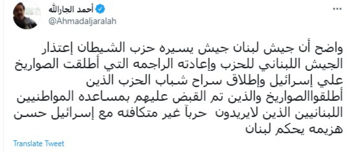 انتقد عميد الصحافة الكويتية ورئيس تحرير صحيفة السياسة الكويتية أحمد الجارالله، اليوم السبت، الجيش اللبناني، عقب واقعة اعتذره لحزب الله، وإطلاق سراح بعض عناصره.