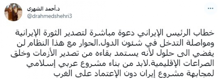 وقال في تغريدة عبر "تويتر" رصدها "المشهد العربي": "خطاب الرئيس الإيراني دعوة مباشرة لتصدير الثورة الإيرانية ومواصلة التدخل في شئون الدول".