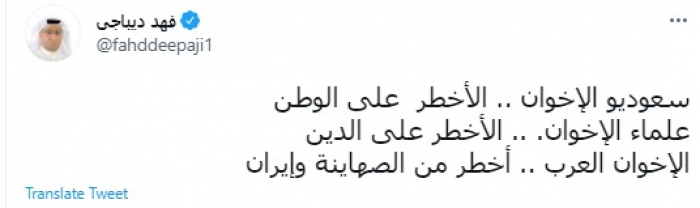 وقال في تغريدة عبر "تويتر" رصدها "المشهد العربي": "سعوديو الإخوان .. الأخطر على الوطن.. علماء الإخوان... الأخطر على الدين.. الإخوان العرب .. أخطر من الصهاينة وإيران".