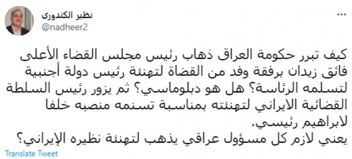 وقال في تغريدة عبر "تويتر" رصدها "المشهد العربي": "كيف تبرر حكومة العراق ذهاب رئيس مجلس القضاء الأعلى فائق زيدان برفقة وفد من القضاة لتهنئة رئيس دولة أجنبية لتسلمه الرئاسة؟ هل هو دبلوماسي؟ ثم يزور رئيس السلطة القضائية الايراني لتهنئته بمناسبة تسنمه منصبه خلفا لابراهيم رئيسي".
