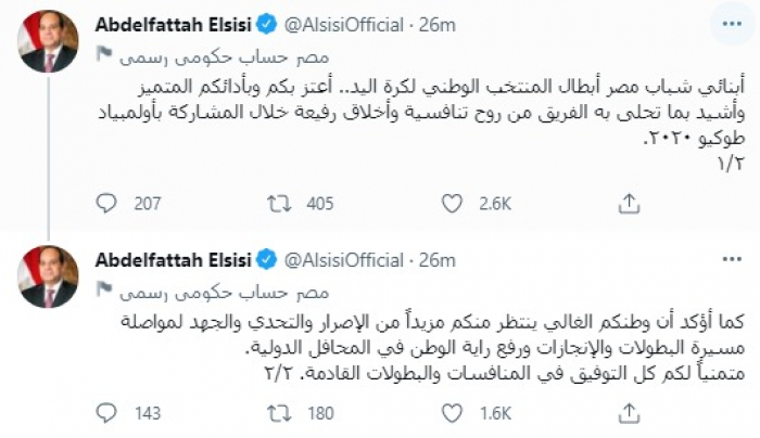 وقال في تغريدات عبر "تويتر" رصدها "المشهد العربي": "أبنائي شباب مصر أبطال المنتخب الوطني لكرة اليد.. أعتز بكم وبأدائكم المتميز وأشيد بما تحلى به الفريق من روح تنافسية وأخلاق رفيعة خلال المشاركة بأولمبياد طوكيو ٢٠٢٠".