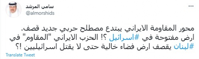 وكتب في تغريدة "تويتر" رصدها "المشهد العربي": "محور المقاومة الإيراني يبتدع مصطلح حربي جديد قصف. أرض مفتوحة في إسرائيل؟.. الحزب الإيراني المقاوم في لبنان يقصف أرض فضاء خالية حتى لا يقتل إسرائيليين".