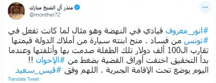 وقال في تغريدة عبر "تويتر" رصدها "المشهد العربي": "أنور معروف قيادي في النهضة وهو مثال لما كانت تفعل في تونس من فساد، منح ابنته سيارة من أملاك الدولة قيمتها تقارب الـ100 ألف دولار تلك الطفلة صدمت بها وأتلفتها وعندما بدأ التحقيق اختفت أوراق القضية بضغط من الإخوان".