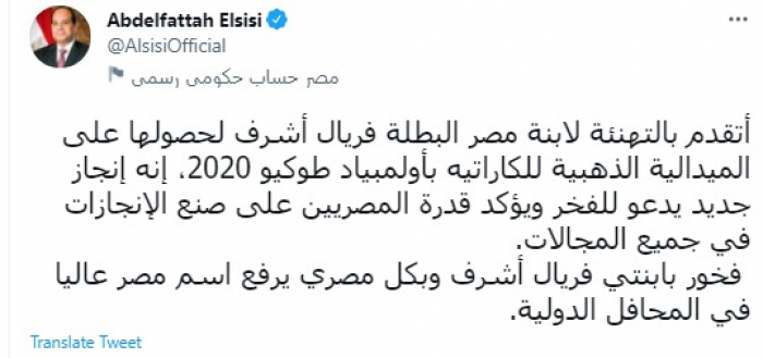وقال في تغريدة عبر "تويتر" رصدها "المشهد العربي": "أتقدم بالتهنئة لابنة مصر البطلة فريال أشرف لحصولها على الميدالية الذهبية للكاراتيه بأولمبياد طوكيو 2020، إنه إنجاز جديد يدعو للفخر ويؤكد قدرة المصريين على صنع الإنجازات في جميع المجالات".