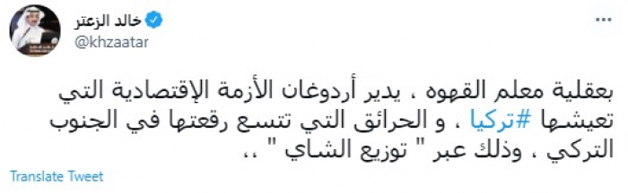 سخر المحلل السياسي السعودي خالد الزعتر، اليوم السبت، من الرئيس التركي رجب طيب أردوغان، مشيرًا إلى إنه يُدير أزمات بلاده بعقلية "معلم القهوة".