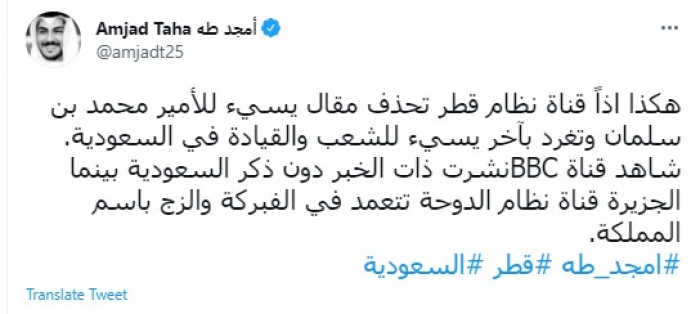وقال في تغريدة عبر "تويتر" رصدها "المشهد العربي": "هكذا اذاً قناة نظام قطر تحذف مقال يسيء للأمير محمد بن سلمان وتغرد بآخر يسيء للشعب والقيادة في السعودية".