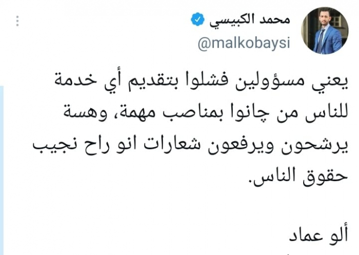 وقال في تغريدة على حسابه بموقع التدوين المصغر تويتر، اليوم: "يعني مسؤولين فشلوا بتقديم أي خدمة للناس من چانوا بمناصب مهمة، وهسة يرشحون ويرفعون شعارات انو راح نجيب حقوق الناس"، مضيفا: "ألو عماد".