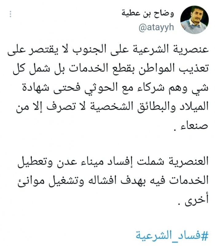 وأضاف أن: "هم شركاء مع الحوثي فحتى شهادة الميلاد والبطائق الشخصية لا تصرف إلا من صنعاء"، موضحا أن: "العنصرية شملت إفساد ميناء عدن وتعطيل الخدمات فيه بهدف افشاله وتشغيل موانئ أخرى"، مختتما بهاشتاج: "فساد الشرعية".