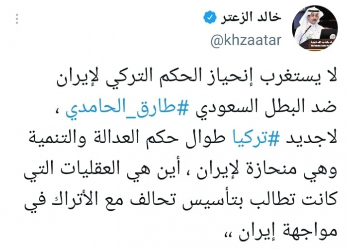 ورأى في تغريدة على حسابه بموقع التدوين المصغر تويتر، اليوم أنه: "لا يستغرب انحياز الحكم التركي لإيران ضد البطل السعودي طارق الحامدي".