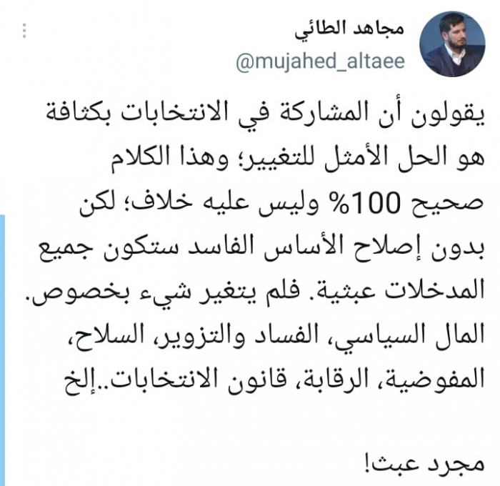 وأكد في تغريدة على حسابه بموقع التدوين المصغر تويتر، اليوم أنهم: "يقولون أن المشاركة في الانتخابات بكثافة هو الحل الأمثل للتغيير؛ وهذا الكلام صحيح 100% وليس عليه خلاف".