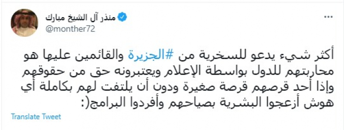 سخر المدون السعودي البارز منذر آل الشيخ مبارك، اليوم الأحد، من قناة الجزيرة القطرية، جراء محاربتها للدول بواسطة الإعلام.