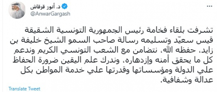 أعلن المستشار الدبلوماسي للرئيس الإماراتي الدكتور أنور قرقاش، اليوم الأحد، تضامن بلاده مع الشعب التونسي ودعم كل ما يحقق أمنه وازدهاره.