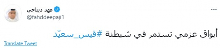 وقال في تغريدة عبر "تويتر" رصدها "المشهد العربي": "أبواق عزمي تستمر في شيطنة قيس سعيّد".
