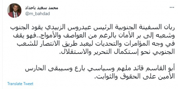 وكتب في تغريدة عبر "تويتر" رصدها "المشهد العربي": "ربان السفينة الجنوبية الرئيس عيدروس الزُبيدي يقود الجنوب وشعبه إلى بر الأمان بالرغم من العواصف والأمواج.. فهو يقف في وجه المؤامرات والتحديات ليعبر طريق الانتصار للشعب الجنوبي نحو استكمال التحرير والاستقلال".