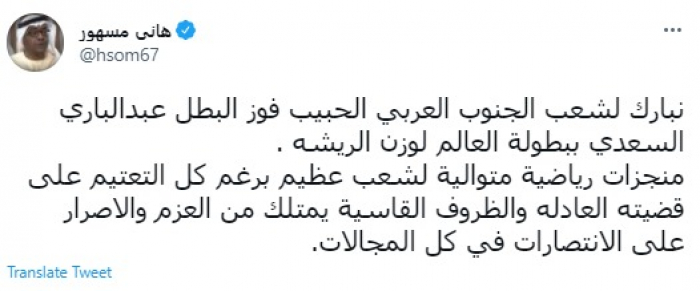وقال في تغريدة عبر "تويتر" رصدها "المشهد العربي": "نبارك لشعب الجنوب العربي الحبيب فوز البطل عبدالباري السعدي ببطولة العالم لوزن الريشة".