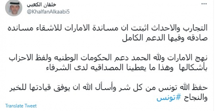 جاء ذلك في مجمل رد "الكعبي" على تغريدة كتبها المستشار الدبلوماسي للرئيس الإماراتي الدكتور أنور قرقاش، قال فيها: "تشرفت بلقاء فخامة رئيس الجمهورية التونسية الشقيقة قيس سعيّد وتسليمه رسالة صاحب السمو الشيخ خليفة بن زايد، حفظه الله، نتضامن مع الشعب التونسي الكريم وندعم كل ما يحقق أمنه وإزدهاره، وندرك علم اليقين ضرورة الحفاظ علي الدولة ومؤسساتها وقدرتها علي خدمة المواطن بكل عدالة وشفافية".