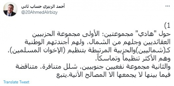 وقال في سلسلة تغريدات عبر "تويتر" رصدها "المشهد العربي": "حول هادي مجموعتين؛ الأولى مجموعة الحزبيين العقائديين وجلهم من الشمال، ولهم أجندتهم الوطنية كـ (شماليين) والحزبية المرتبطة بتنظيم (الإخوان المسلمين)، وهم الأكثر تنظيما وتماسكا. والثانية مجموعة نفعيين جنوبيين، شلل متنافرة، متناقضة فيما بينها لا يجمعها إلا المصالح الآنية".