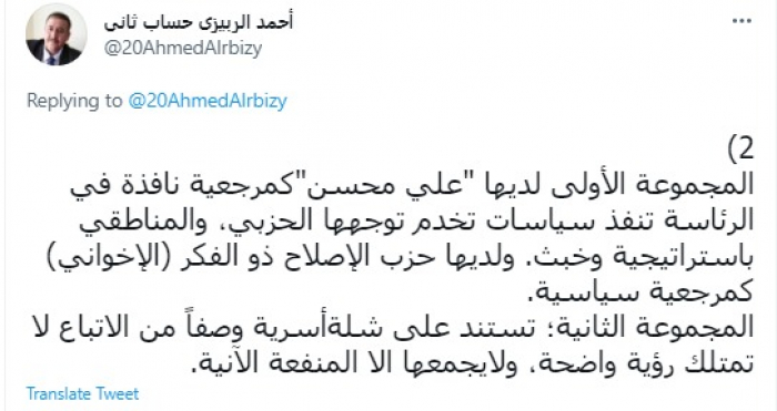 وأضاف: "المجموعة الأولى لديها علي محسن كمرجعية نافذة في الرئاسة تنفذ سياسات تخدم توجهها الحزبي، والمناطقي باستراتيجية وخبث. ولديها حزب الإصلاح ذو الفكر (الإخواني) كمرجعية سياسية، المجموعة الثانية تستند على شلة أسرية وصفا من الأتباع لا تمتلك رؤية واضحة، ولايجمعها إلا المنفعة الآنية".