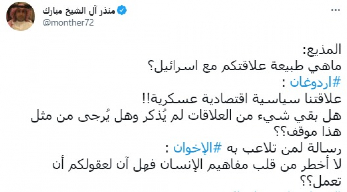 وقال في تغريدة عبر "تويتر" رصدها "المشهد العربي": "المذيع: ماهي طبيعة علاقتكم مع إسرائيل؟.. أردوغان: علاقتنا سياسية اقتصادية عسكرية".