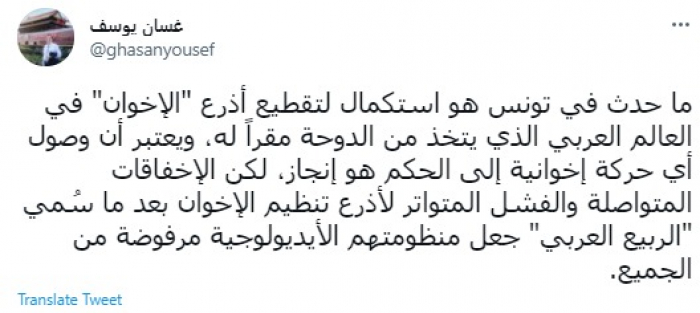 وكتب في تغريدة عبر "تويتر" رصدها "المشهد العربي": "ما حدث في تونس هو استكمال لتقطيع أذرع الإخوان في العالم العربي الذي يتخذ من الدوحة مقراً له، ويعتبر أن وصول أي حركة إخوانية إلى الحكم هو إنجاز".