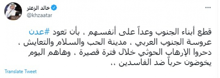 وقال في تغريدة عبر "تويتر" رصدها "المشهد العربي": "قطع أبناء الجنوب وعدًا على أنفسهم، بأن تعود عدن عروسة الجنوب العربي، مدينة الحب والسلام والتعايش".