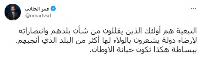 وقال في تغريدة عبر "تويتر" رصدها "المشهد العربي": "التبعية هم أولئك الذين يقللون من شأن بلدهم وانتصاراته لإرضاء دولة يشعرون بالولاء لها أكثر من البلد الذي أنجبهم. ببساطة هكذا تكون خيانة الأوطان".