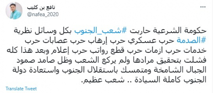 وكتب في تغريدة عبر "تويتر" رصدها "المشهد العربي": "حكومة الشرعية حاربت شعب الجنوب بكل وسائل نظرية الصدمة حرب عسكري، حرب إرهاب، حرب عصابات، حرب خدمات، حرب أزمات، حرب قطع رواتب، حرب إعلام".