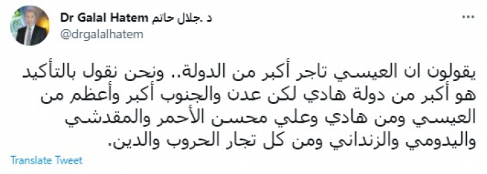 وكتب في تغريدة عبر "تويتر" رصدها "المشهد العربي": "يقولون أن العيسي تاجر أكبر من الدولة.. ونحن نقول بالتأكيد هو أكبر من دولة هادي".