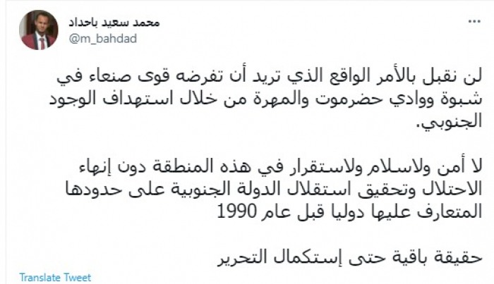 وقال في تغريدة عبر "تويتر" رصدها "المشهد العربي": "لن نقبل بالأمر الواقع الذي تريد أن تفرضه قوى صنعاء في شبوة ووادي حضرموت والمهرة من خلال استهداف الوجود الجنوبي".