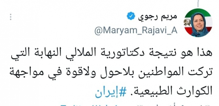 أكدت زعيمة المعارضة الإيرانية، مريم رجوي، مسؤولية نظام ملالي طهران، عن سقوط ضحايا في الكوارث الطبيعية.