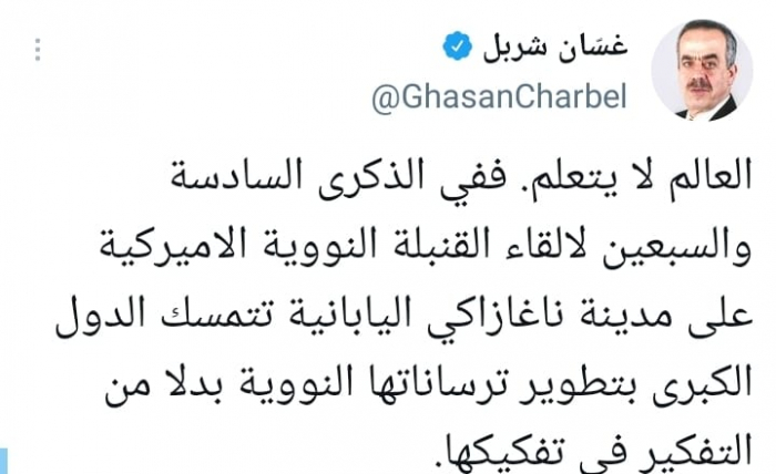 تعجب الكاتب الصحفي غسان شربل من استمرار الدول الكبرى في تعظيم ترسانتها النووية، على الرغم من بشاعة جريمة تفجيرها في ناجازاكي باليابان.