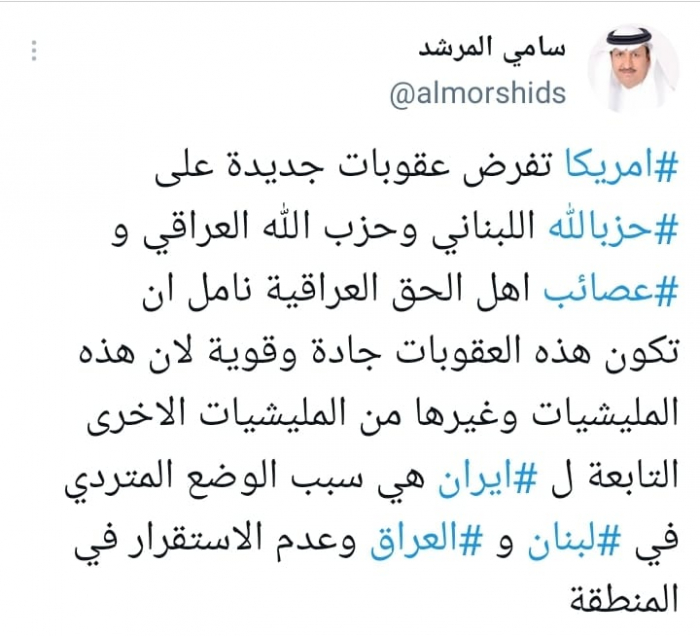 وقال في تغريدة على حسابه بموقع التدوين المصغر تويتر، اليوم إن: "أمريكا تفرض عقوبات جديدة على حزب الله اللبناني وحزب الله العراقي وعصائب أهل الحق العراقية".